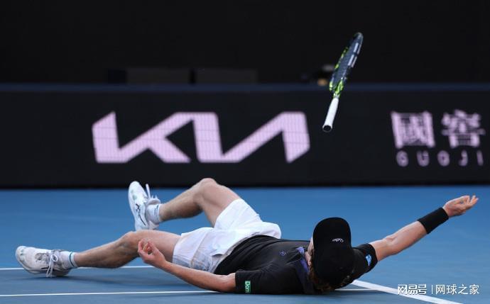 最后来猜一猜认一认。下面这张图片是一位澳网资格赛球员获胜之后倒地庆祝,他赢了一位本赛季将退役的名将,您能认出他是谁吗?