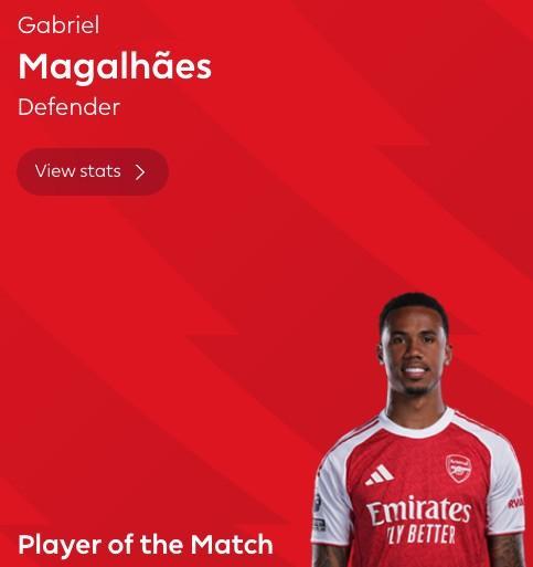 此役客场对阵布莱顿,首发出战的加布里埃尔表现出色,4次争顶成功,完成14次解围,均为全场最多,包括一次门线解围。